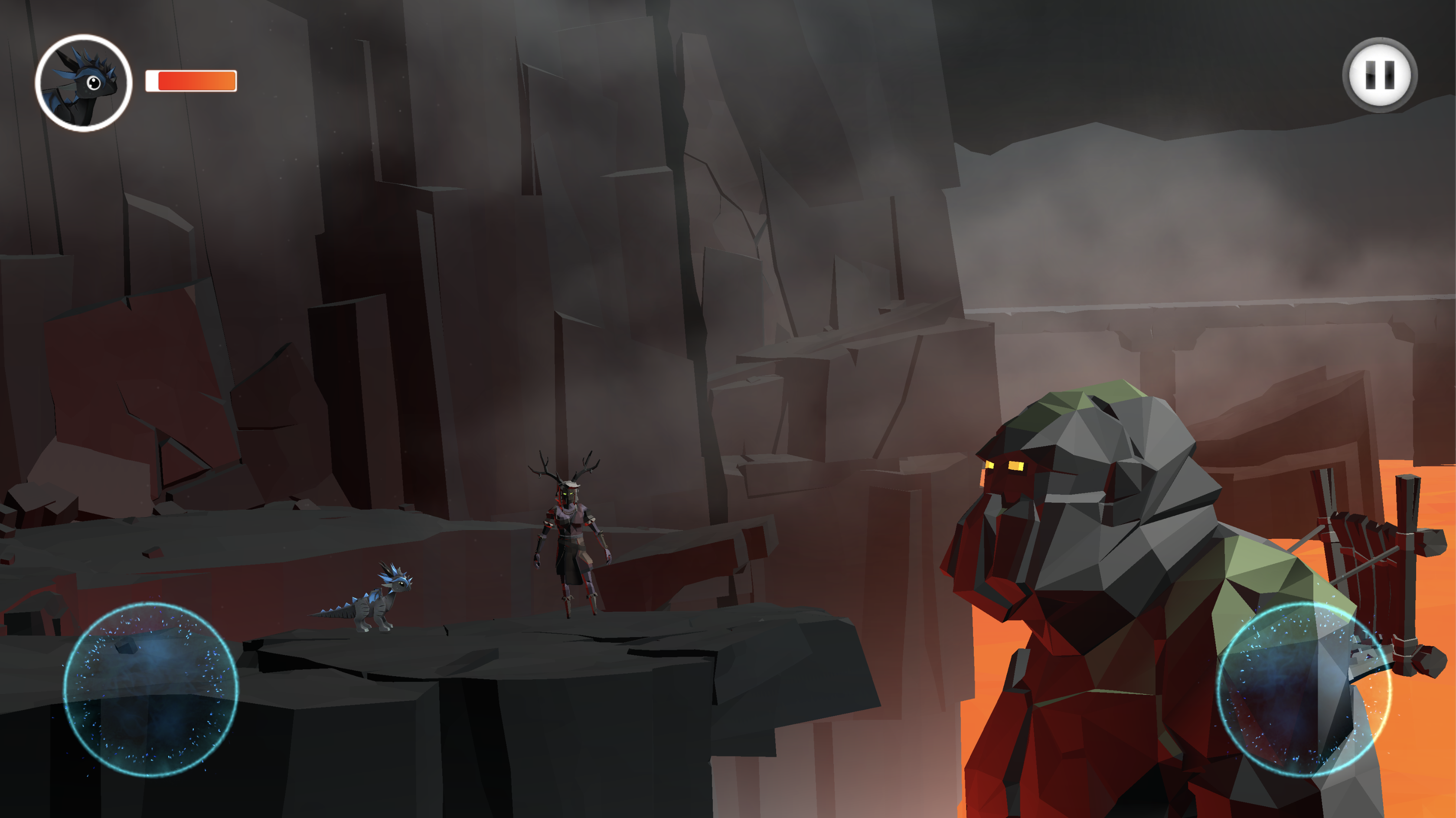 Each level gives to the player the opportunity to interact with the dragon and the golem in a new way. The dragon alternatively runs and jumps in some levels and knocks down enemies in others. The Golem can push forward through lava or use his hands as shields or to break rocks.